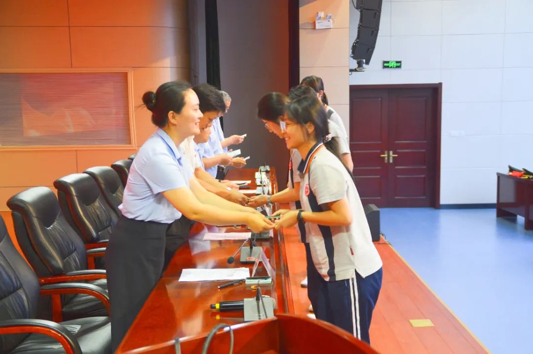 在热烈的掌声中,校领导为新团员颁发团徽和团员证。金色的团徽在胸前闪耀,象征着青春与使命的交融,激励着新团员们勇毅前行。